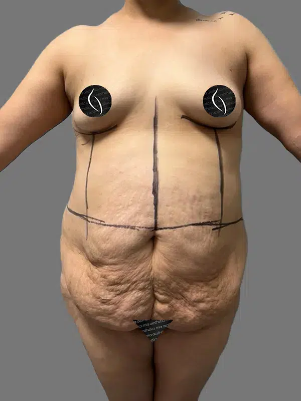 This patient was left with a sagging skin problem after losing a significant amount of weight. Through a tummy tuck, the surgeon was able to remove the excess skin and create the beautifully flat tummy and toned waistline she deserved after meeting her weight loss goals. Just as importantly, the patient is now free of the burden and uncomfortable pulling that excess skin can create.