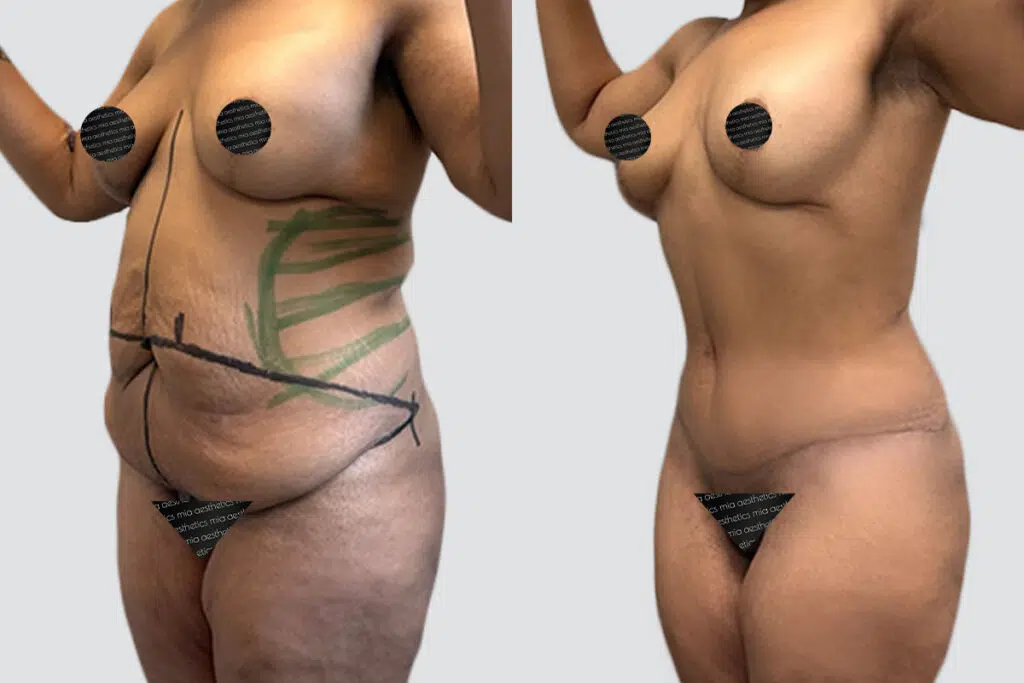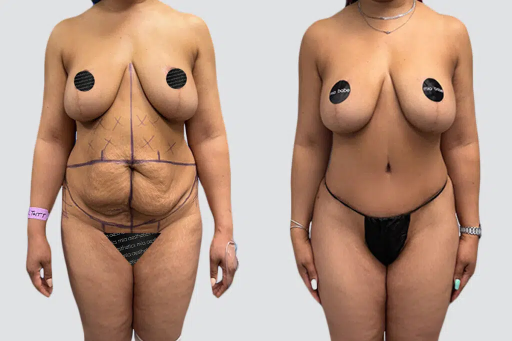 This patient wanted to get her pre-pregnancy belly back, and a tummy tuck was the perfect way to do it. She now enjoys a gorgeous waistline and flat belly. As you can see, her tummy tuck scar is super low and easily hidden in almost anything — including the right bikini bottom.